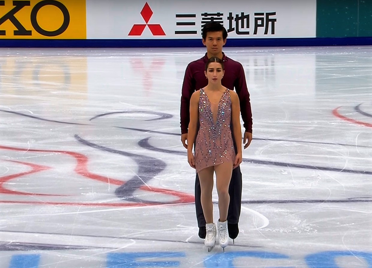 Free Skate to SOS d'un terrain by Dimash Kudaibergen: Denis skated his Free Skate to his famous song done by a fellow Kazakh artist. Ten's costume was a sleek, modern look that included silver sequin embellishments as well as chiffon volants/mini-ruffles. Overall, it was a good costume for the beautiful and deep-meaning song. If there was any critique, I don't think he needed the crystal-detailed waist. Otherwise, it was just fine.