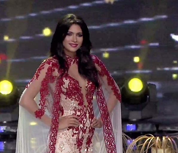 8. Miss Grand Venezuela Tulia Aleman Ferrer: The super gorgeous Tulia almost got the Top Crown by getting the 1st Runner-up title (and well deserved!). She changed her gown from what she wore for the Preliminaries to this white and red sequined design above from Indonesian designer ANAZ, who created the gown for Miss Grand South Sudan as well as the outgoing "Miss Grand International 2016". It was my 8th favorite of the Top 10. While I liked the stage impact of that cape (Oh Sooooo popular right now with Pageant Girls!), the overall design seemed a bit Too-Mucheey. All that Asian-inspired red sequined applique seemed forced and in addition, it didn't need the silver ones on the column gown; that could have remained a simple elegant white silk crepe column gown. It would have served as a better highlight to the cape and red sequins down the front of the dress. With that said, Tulia did "make it work" and the "Too Mucheey" overdesigned gown was saved...by her STUNNING beauty.