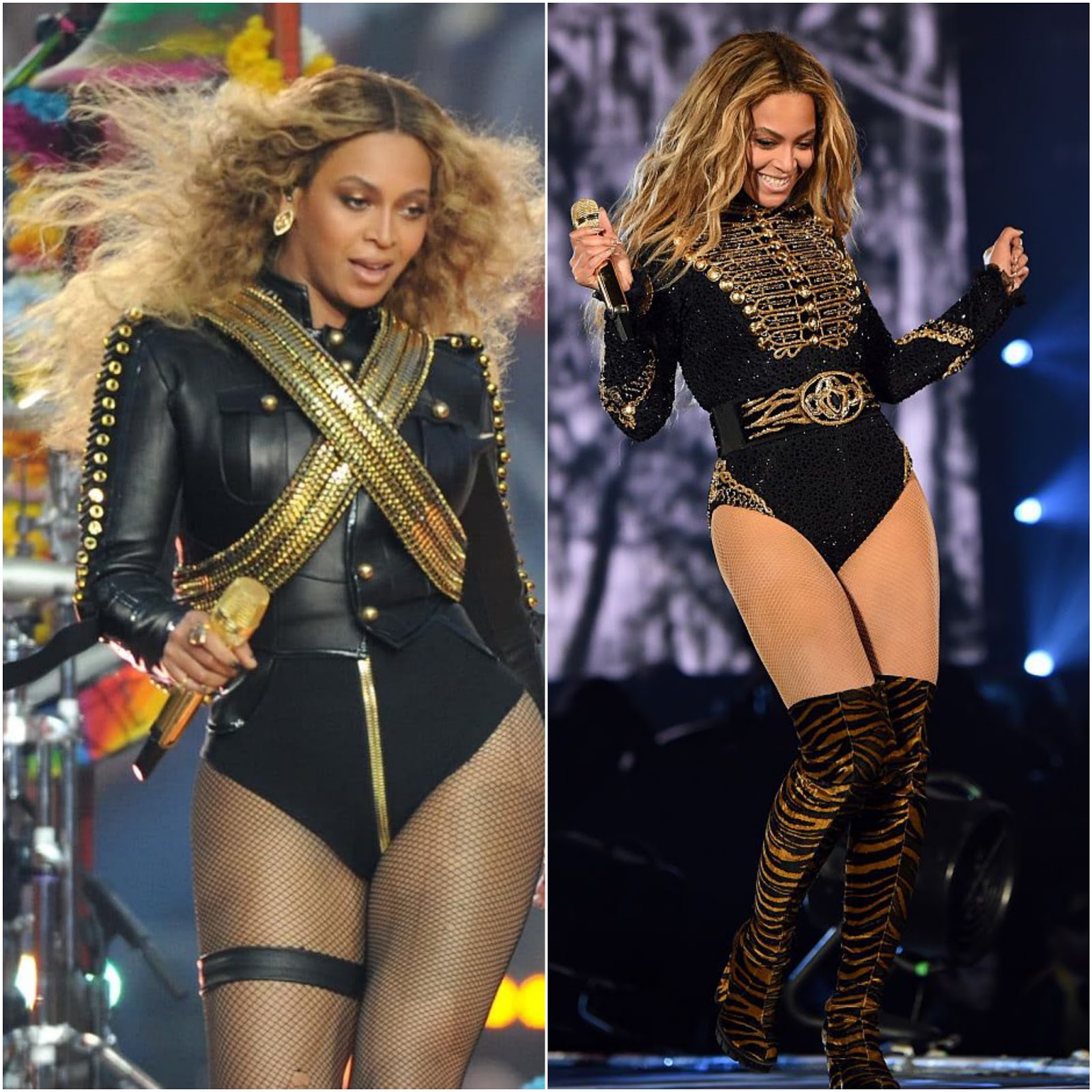 Beyonce in DSquared2 at the Super Bowl Halftime Show (Left) and in Roberto Cavalli for her "Formation" Tour
