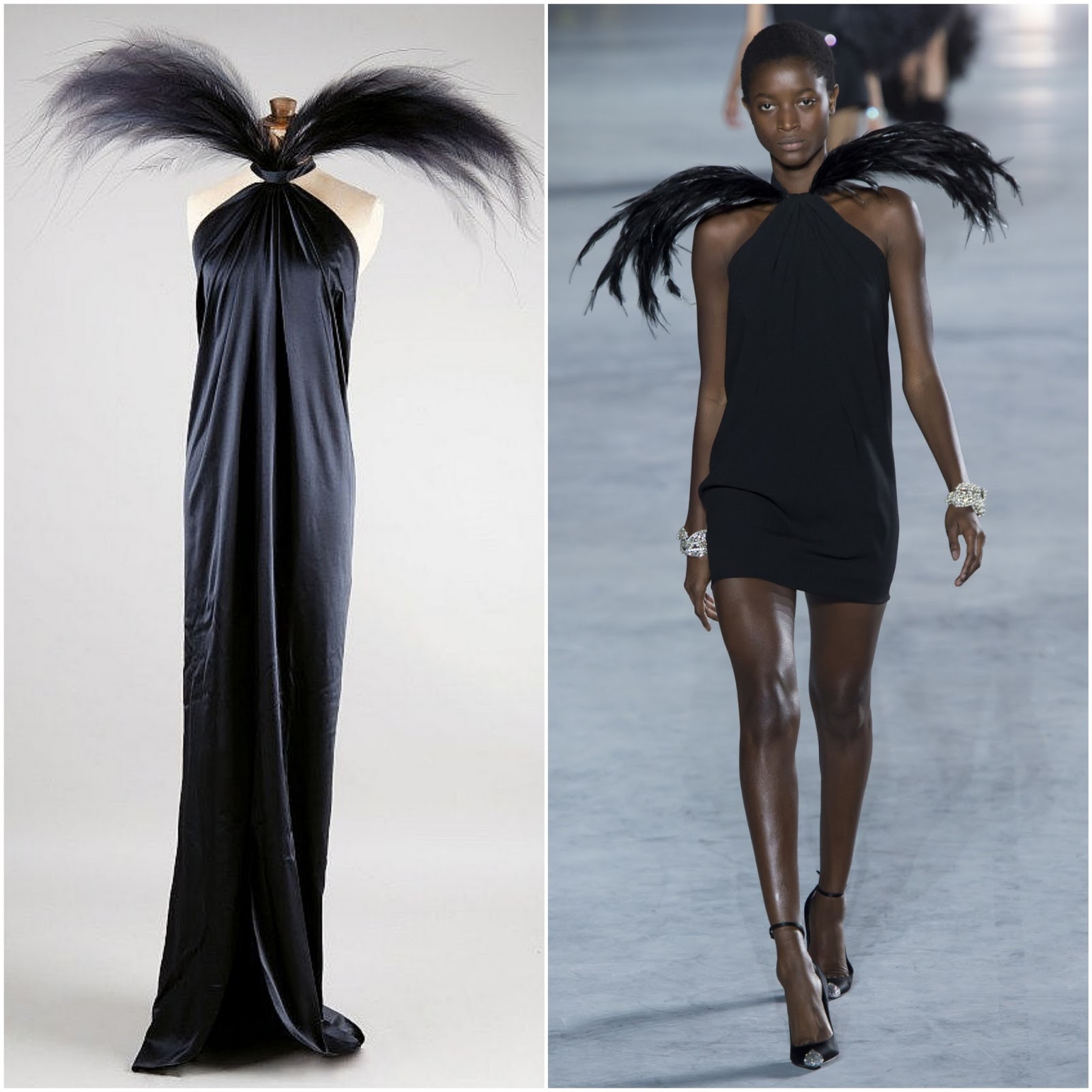 Feathered Beauty: (L to R) Yves Saint Laurent Spring/Summer Haute Couture 1979 and look from Saint Laurent Spring/Summer 2018