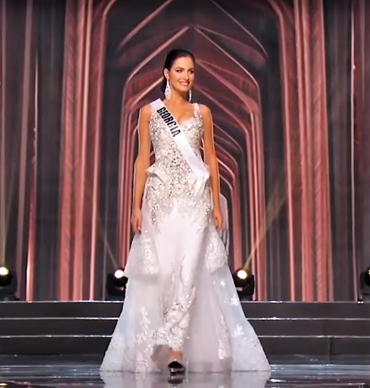 14. Miss Universe Venezuela Mariam Habach: One word--WOW! Mariam--who was a BIG FAVORITE to win the crown but didn't even place into the Semi-Finals--entered the stage in what first looked like a ballgown with a sequined top and feathered bottom skirt. Then...slowly but surely, she looked to the right and then to the left and VOILA: She unsnapped the feathered white/blue ombre shaded feathered skirt and...With a twirl, showed the inner sequined column gown hiding underneath. It was a MAJAH Pageant Moment and kudos to Venezuelan designer Nidal Noauihed for the design! Watch this video below to see the Gown Moment that I was talking about (and hootin' and hollerin' from the audience!):