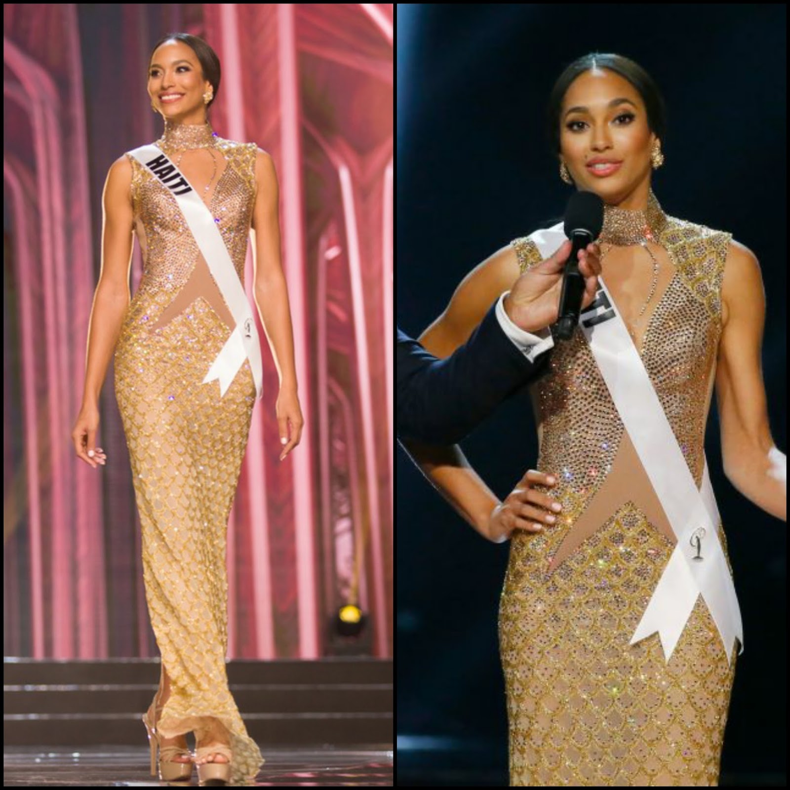 18. Miss Universe Haiti Raquel Pelissier: Raquel is a stunner, let's just begin there. I think it was wise to not weigh down the already 5' 11" beauty with anything overwhelming. I liked this golden column gown that was designed 28 year-old Colombian designer Diego Fernando Marin Mendoza. The style featured crystals throughout--in rose gold and yellow gold--with nude illusion panels. It was reminiscent of Atelier Versace gowns of the past, and I admit, just a teeny tiny "Figure Skating Costume"-like--especially at the top. Yet still, I liked it!