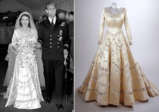 The Real Thing: Princess Elizabeth and Prince Philip of Greece and Denmark Wedding: Her wedding gown designed by British fashion designer Norman Hartnell. Princess Elizabeth used clothing ration coupons to pay for the dress. The gown was made of ivory silk and 10,000 pearls imported from the USA. At first when I was watching the series and the wedding scene, I thought that the "costume" wedding gown was a bit too stiff and crinoline'd--as opposed to the actual photos I had seen of the wedding and the gown. In some of the photos, her wedding dress does look less crinoline'd (as if there's no tulle underskirts) while in the museum display photo, it looks more like it was made for the TV series .