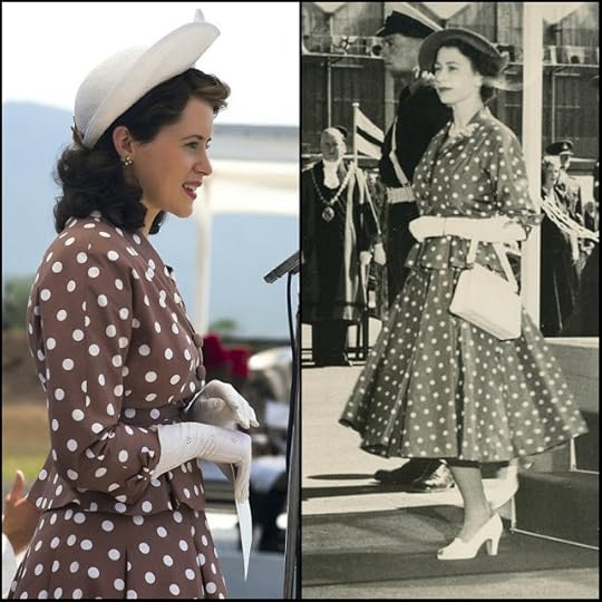 Polka Dot Queen: Actress Claire Foy as Queen Elizabeth (left) in "The Crown", and the real Queen Elizabeth II (right) during her Commonwealth Tour 1952 Kenya.