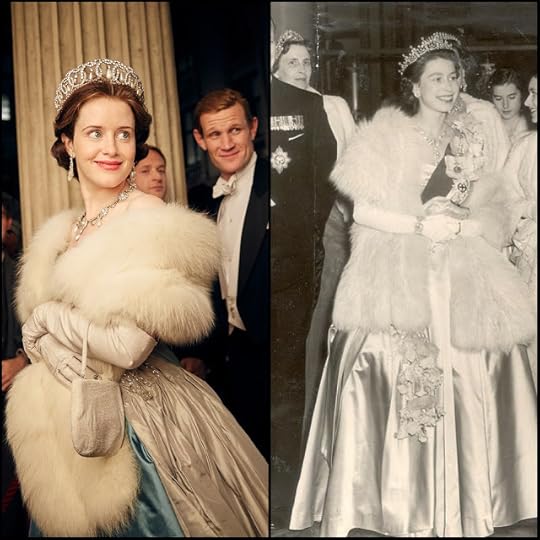 As the big Royal Couture fan that I am , I was curious to check out some of the show's costumes vs. the actual fashions these real-life royals wore (if there were photos of course!). I think that Ms. Clapton did an exceptional job. I cannot even imagine having such a task. She said that over 95% of the principals costumes were custom made while many of the extras (and there were LOTS!) wore vintage garments from costume shops. Lets take a look at some of the gorgeous "The Crown" costumes for some of the main "characters" and what they actually wore:
