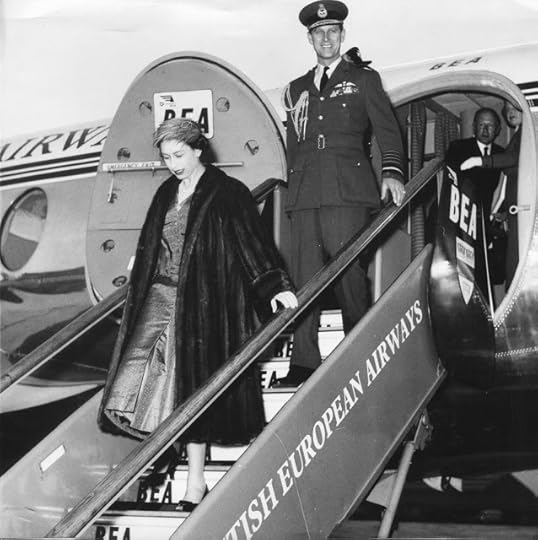 Mink Travel: Queen Elizabeth in mink fur coat and silk dress, and Prince Philip in uniform disembarking a flight on B.E.A. British European Airways