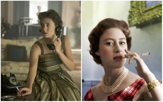 Smokey Princess: Actress Vanessa Kirby portraying Princess Margaret (top photo, left lower photo) in "The Crown", the actual Princess Margaret (right, lower photo)