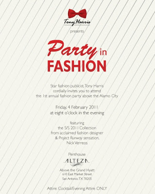 This Friday, at the Penthouse Alteza in The Downtown San Antonio Texas Grand Hyatt, there will be a very special fashion event titled "Party in Fashion" produced by Tony Harris Productions, the UBER chic Texas fashion pr house. A "little birdie" has told me that, all of San Antonio's fashion glitteratti will be there! Need I remind you that this is the actual First Annual "Party In Fashion" event in San Antonio Texas!!??