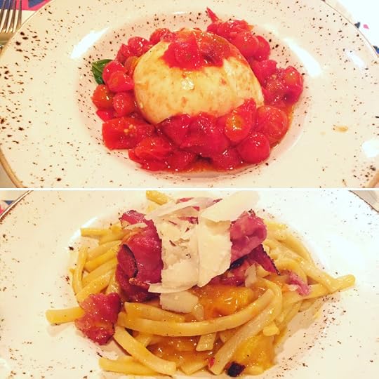 Delicious Dinner For One: Starter of Mozzarella di Bufala in Boccaccio (top photo) and Main Entree of Scialatiello Ghiotto Pasta (pasta with bacon, Parmesan cheese and tomatoes)--Bottega Ghiotta Milan Italy