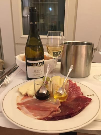 Post-election Room Service Dinner: My hotel in Milan was having a special of a bottle of white wine, cheese, salami/prosciutto plate for 20 Euros! Naturally, I said "Si!" Usually, this would be considered Appetizers but since it was just me...it was a nice full dinner! And it was DELIZIOSO!!!!