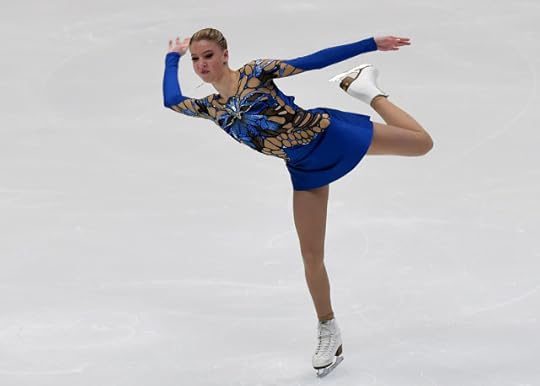 Maria Sotskova Russia Short Program to Butterflies Are Free by Alfred Schnittke: I actually liked this butterfly-inspired costume worn by Russia's Maria Sotskova. I know it might be a bit been there/done that to wear a butterfly costume to music called "Butterflies Are Free" but...I still think it worked. The butterfly detail in her costume was beautiful and very intricate and I liked the deep blue color as well as the look of broken butterfly wings. Also, it's not every day one sees a stiffer stretch sateen as fabric for a Ladies Figure Skating Costume so...this was a nice change of pace.