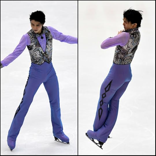 Yuzuru Hanyu Japan Short Program to Let's Go Crazy by Prince: Yuzuru aka "Mr Costumes!" aka "2014 Olympic champion", wore this purple ensemble to skate to his Prince-themed Short Program. The look involved a purple chiffon shirt, skin tight purple pants (possibly attached to that shirt, therefore, a jumpsuit) with black sequined embellishment and paisley-like black, gray, white, silver and blue vest with crystal details. Did he look like the Master of Ceremonies for a Prince Tribute Las Vegas Concert? Totally. But I like it! By the way, in case you are a follower of Yuzuru, you obviously would have notice that this costume above was a change of costume to what he wore...