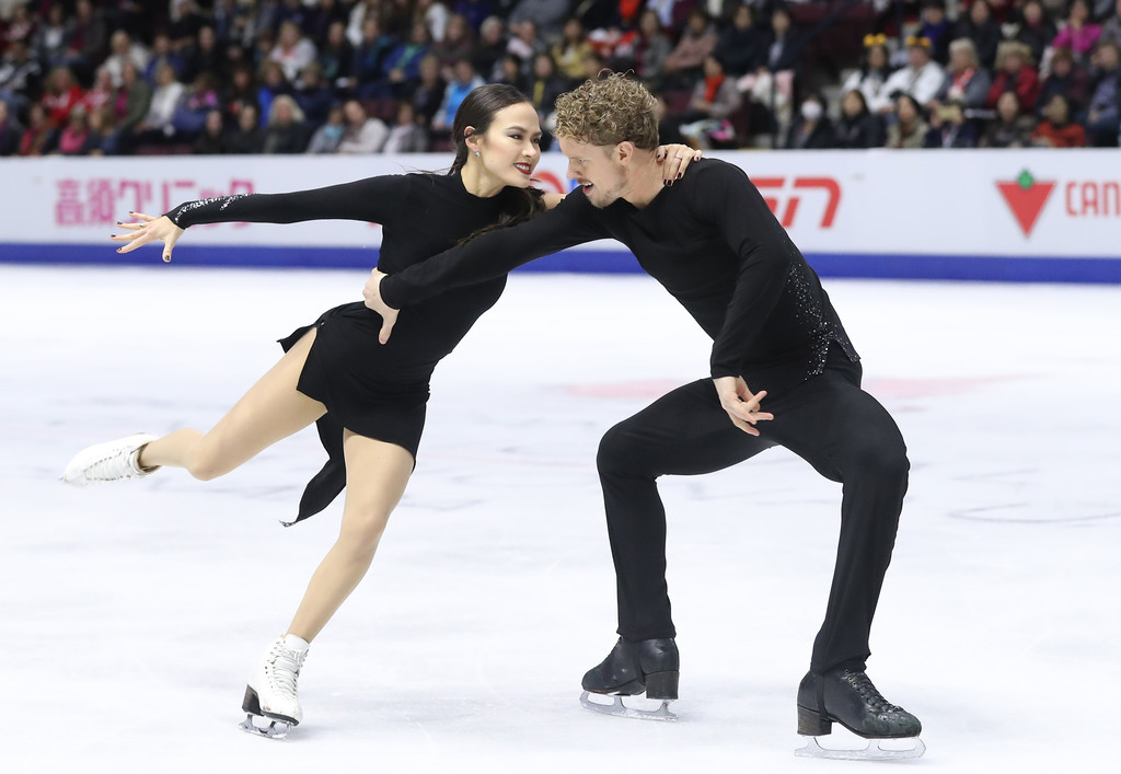 Madison Chock and Evan Bates of USA Short Dance to Blues: Bad to the Bone by George Thorogood, Hip Hop: Uptown Funk by Bruno Mars--These were interesting, sexy looks from USA's Chock and Bates for their Short Dance. Madison looked punk-tastic in her turtleneck crop top with "ripped" sleeves and sexy low-slung faux leather super-skinny pants. Evan was looking like he went to Zara and bought a jersey knit top, under t-shirt and sleek denim skinny pants. I still liked it.