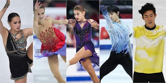 Finals Costumes--Ladies and Men Skaters at ISU Grand Prix of Figure Skating 2019 Finals (L to R) Alina Zagitova of Russia, Anna Shcherbakova of Russia, Alena Kostornaia of Russia, Yuzuru Hanyu of Japan and Nathan Chen of USA--2019 Grand Prix Finals, Torino Italy