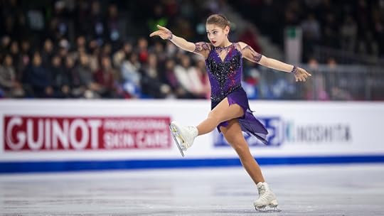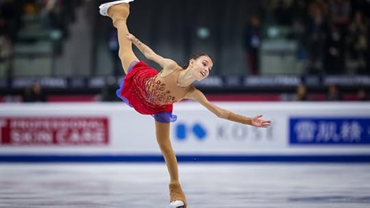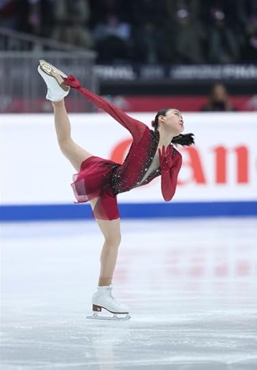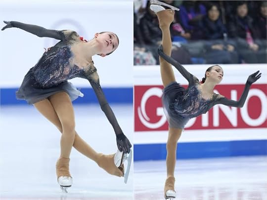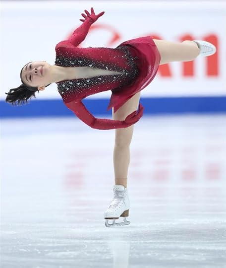 Rika Kihira Japan Short Program to Breakfast in Baghdad by Ulf Wakenius performed by Youn Sun Nah--Japan's Rika Kihira wore this red sequined costume. I liked the design and black ombre dye effect under the silver rhinestones, as well as the delicately asymmetrical skirt. The look was a bit "Vampira" but the red and black coloring was impacting, especially against her porcelain-like skin. She changed the costume she had been wearing at previous competition events and started wearing this red one at the NHK Trophy 2019.