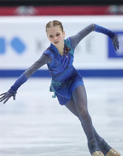 Alexandra Trusova Russia Free Skate to Pray (High Valyrian) (from “Game of Thrones” soundtrack) by Matthew Bellamy, The Night King (from “Game of Thrones” soundtrack) by Ramin Djawadi--For her Free Skate to "Game of Thrones" music, she wore this costume. I think she was trying to vibe Daenarys "Khaleesi" Mother of Dragon's Season 3 costume, with the blue color and gray-ish tights. I get it, it was a nice attempt but it still looked a bit "Junior"-like (she is only FIFTEEN after all). I am not a fan of the sheer "leggings" but I give the costume designer points for trying to mimic the "striped" look in her costume to match the famous fur coat worn by the show's "Daenarys" character.