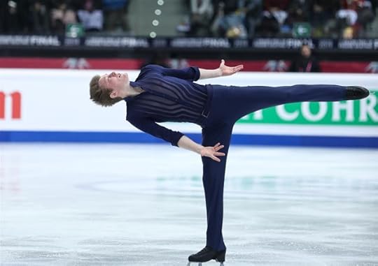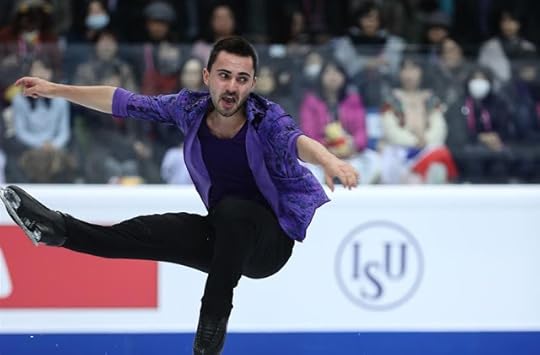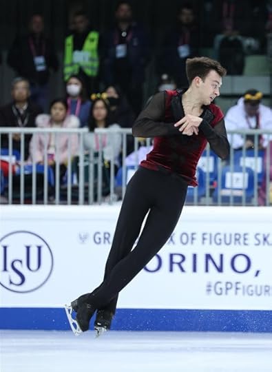 Dmitri Aliev Russia Short Program to Je Dors Sur Des Roses (from "Mozart L'Opera Rock) by Mikelangelo Loconte--Dmitri wore this costume consisting of a wine-red velvet long vest with embroidered lapels, see-through black shirt, and black pants. It was "Mozart"-y I guess and it fits him nicely but as far as an overall design, it was a bit off-the-rack from a Skating Shop.