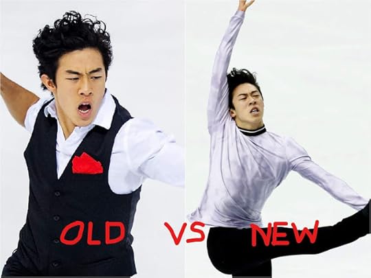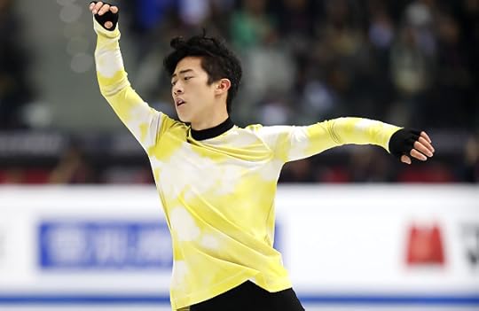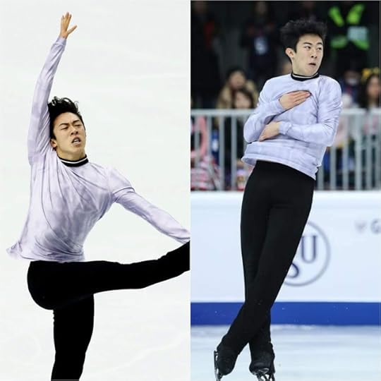 Nathan Chen USA Short Program La Boheme performed by Charles Aznavour--Nathan skated his Short Program to the music of Armenian-French singer Charles Aznavour. This was a costume change from what he had been wearing at previous Grand Prix competition events this season (the I'm-a-Waiter-at-a-Wedding Shirt/Vest/Red Pocket Hankie Look)...