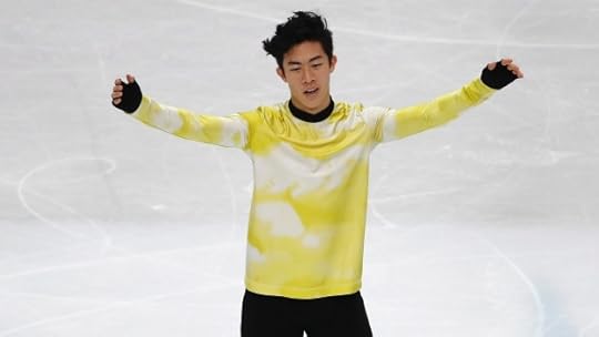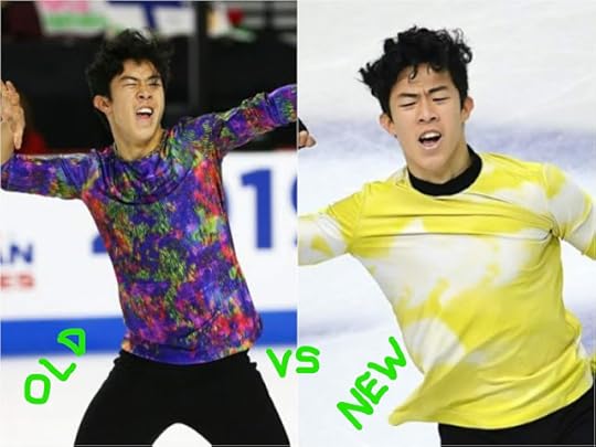 Free Skate to Music from "Rocketman": Goodbye Yellowbrick Road by Taron Egerton, Jamie Bell; Rocketman by Taron Egerton and Benny and the Jets by Logic, Elton John and Pink--For his Free Skate to "Rocketman", Nathan changed from a psychedelic, multicolored tie-dye stretch shirt to...a yellow-and-white tie-dye stretch shirt. It was obviously made by the same people who did his Short Program costume and maybe were under A) Budgetary or B) Time constraints and decided to just cut the same style top but in a different fabric. He looked like an extra in a vintage "Star Trek" episode. It looked sloppy and the unfitted style was distracting as it flopped around during the skate. On a good note: At least it was YELLOW, honoring the Elton John "Goodbye Yellowbrick Road" music. But, in case you didn't understand my review: I wasn't a fan.