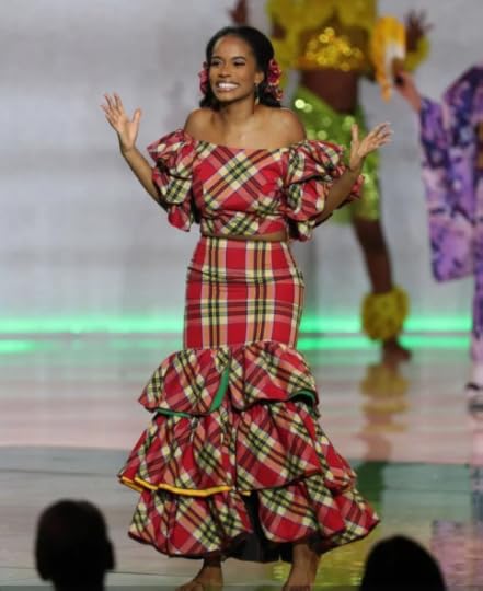Jamaican Madras--For her "Dances of the World" Introduction, Toni-Ann wore this traditional Jamaicas madras-plaid ensemble, consisting of an off-the-shoulder crop top with ruffled sleeves and mermaid-shaped multi-tiered skirt with ruffles. She danced her way into the judges' hearts--Miss World 2019 Final, London UK