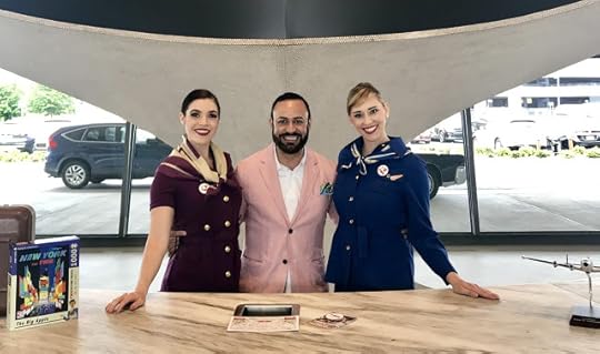 Assistance With A Smile--Nick Verreos with Stevie Heptig and Sarah C., the "TWA Hostesses" at the TWA Hotel Terminal--TWA Hotel, JFK Airport
