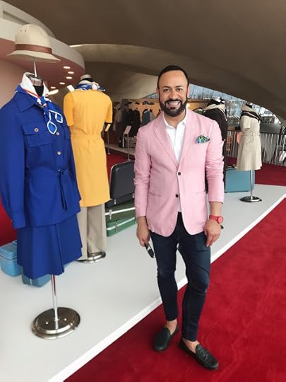 Hostesswear--Nick Verreos at the TWA Hotel JFK Airport, at the TWA Hostess/Flight Attendant Exhibition of TWA Uniforms through the decades from top fashion designers--TWA Hotel, JFK Airport