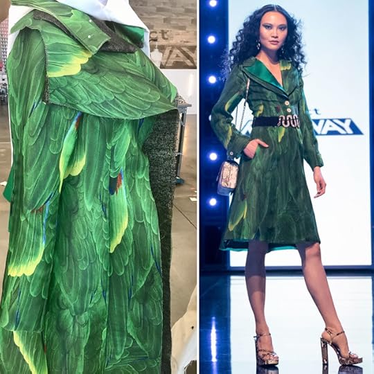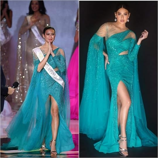 Miss Universe Philippines Gazini Ganados--This golden gown worn by Miss Universe Philippines Gazini Ganados was one of my BEST OF 2019 PAGEANT GOWNS for sure. It was inspired by the Philippine Eagle and designed by Filipino Designer Cary Santiago . The gown featured a fabric manipulated textured design, a fit-and-flare strapless silhouette with bird-and-wing-like details at the bust, and pleated lower half, creating a dramatic bottom skirt effect. This dress stood out for uniqueness and Haute Couture-like drama.