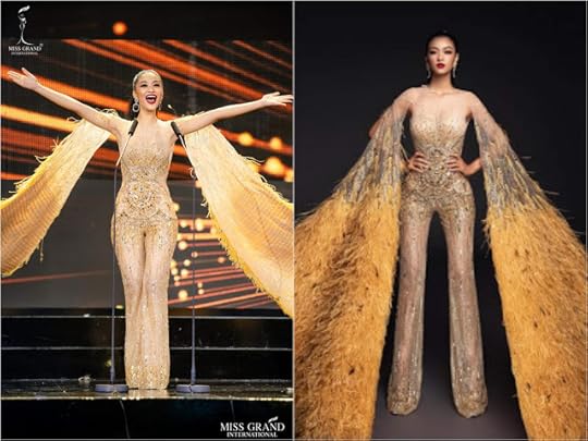 Miss Grand Vietnam Nguyen Ha Kieu--Miss Grand Vietnam triumphed the Evening Gown Preliminaries with wearing the only jumpsuit "gown". And I loved it! It was designed by Do Long and featured a stunning golden/nude sequined jumpsuit with hand-applied yellow feathered exaggerated sleeves. It was dramatic, stage-worthy and fashion unique! When she appeared on stage, all I could say was "You Go Girl!". And that is why she made my Best of 2019 Pageant Gown List!