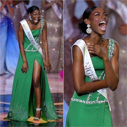 1. Miss World Nigeria Nyekachi Douglas--One word: WOW! The nearly six-foot-tall beauty wore this emerald green one-shoulder sheath of a gown for the Final and well, she got MY HIGHEST Gown Score! The crepe design featured a fitted bodice with one shoulder strap and a wrap, slit-skirt that showed off her leg. It also had silver jeweled sequins that were placed correctly and elongating her already long figure. At the hem, there were delicate crystal feather-like designs. This was elegant, chic and thoroughly Pageant Modern.