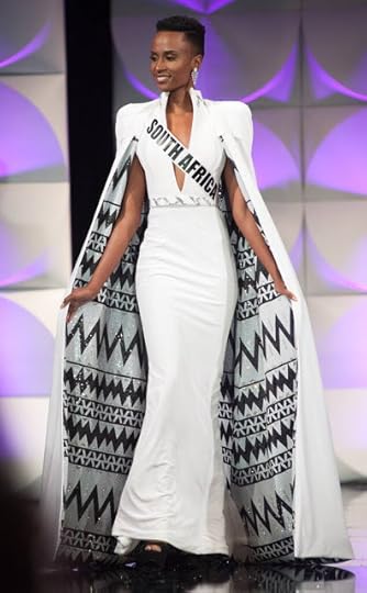 Miss Universe South Africa Zozibini Tunzi--STUNNING. A breath of fresh gown air, after so many too-heavily-beaded cheap polyester-looking tacky neon-colored gowns at this past year's "Miss Universe" Preliminary Competition. When Zozibini came out in this white gown with matching cape, it was like a Gwyneth Paltrow-Tom Ford moment at the Oscars. She looked elegant, divine, elegant, regal-like. And to top it all off, the cape (whose outer layer is white velvet) featured a gorgeous sequined black-and-white printed Xhosa-inspired patterning motif that just about made me swoon. This was Gown Perfection, custom-designed by South Africa's Biji-La Maison de Couture . Definitely one of my TOP BEST of 2019!