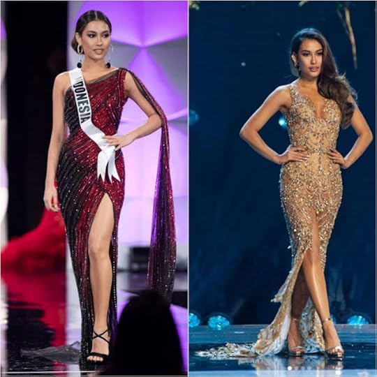 Miss Indonesia Frederika Alexis Cull--Let's start with the dress on the left, the design worn for the Miss Universe 2019 Preliminaries: Frederika took my breath away in this one-shoulder red and black sequined gown from Indonesian designer Tex Saverio . The design was inspired by the "Spirit of the Phoenix" and fire and featured a side-front slit as well as a shoulder "fall" drape. She looked Cher-like and ready to present an Academy Award...or get one herself!