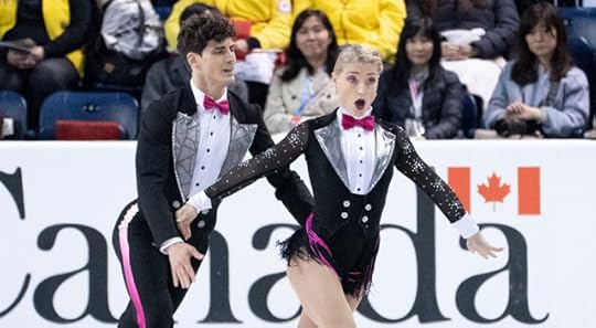 Paul Poirier and Piper Gilles Canada Rhythm Dance--For their Rhythm Dance, Gilles and Poirier of Canada paid tribute to the early years of Hollywood, skating to March: Movies Were Movies (from "Mack and Mabel") by Jerry Herman; Foxtrot: Look What Happened to Mabel (from "Mack and Mabel") by Jerry Herman; Quickstep: Entr'acte, Tap Your Troubles Away (from "Mack and Mabel") by Jerry Herman. I loved the very impacting costumes, ready for the stage (or ice!); the old-school costume-y tuxedos were so Radio City Rockettes, they were perfect. I loved the silver, bubblegum pink, her sequined sleeves and especially the fringe.