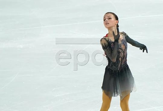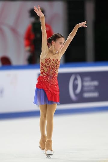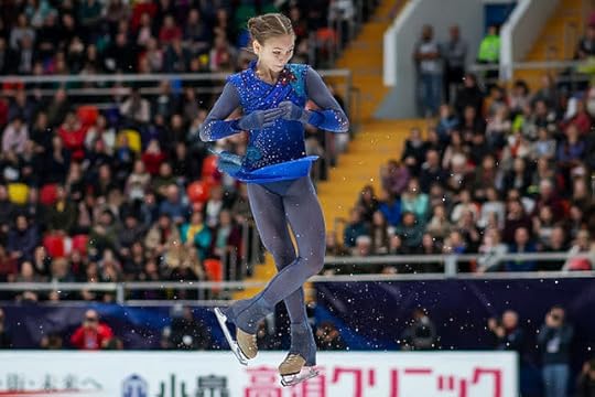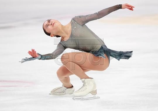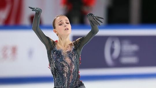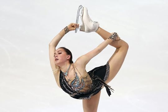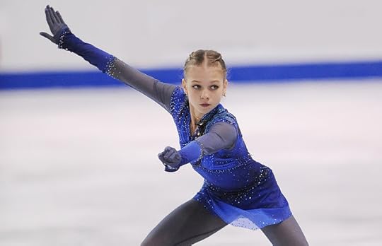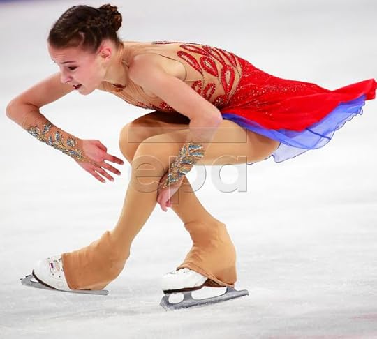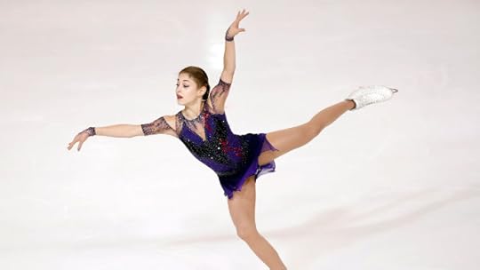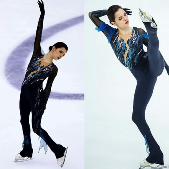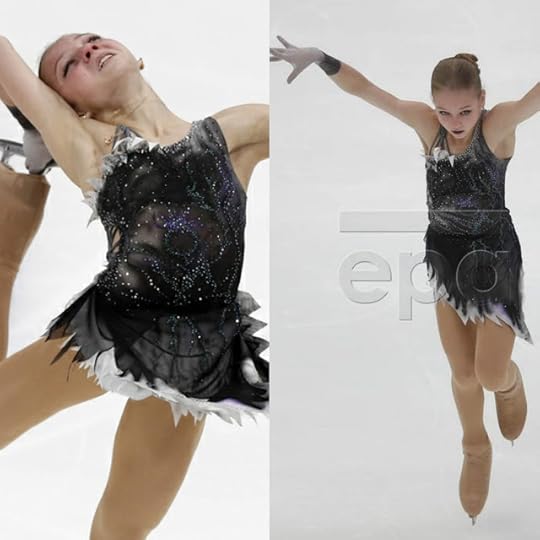Alexandra Trusova Russia Short Program to Solveig's Song (from "Peer Gynt") by Edvard Grieg performed by Meav, In the Hall of the Mountain King (from "Peer Gynt") by Edvard Grieg--You can't tell in the photos above but the costume started out the light gray that is peaking from underneath...halfway through her program, she flipped the top of the costume down and did one of those on-the-spot "Costume Changes" that we have seen as of late in these Figure Skating Competitions to expose something different. The "new" costume became darker, more "mysterious". To be honest, I am not sure if I am a fan of either the first or the "costume change" evolution. It looks a little too "Witchy"/Bedazzled Betty Rubble.