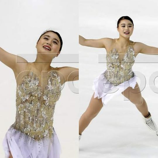 Yuna Shiraiwa Japan Short Program--Skating to Concertino Bianco for Piano by Georg Pelecis, Shiraiwa wore this heavily-beaded gold-and-silver sequined costume with a white petal-shaped skirt. The costume was pretty impressive and all that bead-work is very expensive and made quite a costume impact.