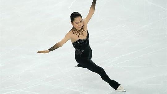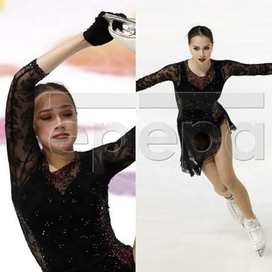 Alina Zagitova Short Program--Skating to Me Voy by Yasmin Levy, Russia's Olympian Alina Zagitova was vibing the Spanish flamenco theme with this black lace and sequined costume. I wasn't overly moved by this look; to be honest, it seemed a bit "old" for her. All that lace and darkness reminded me of the black lace Mantillas the widows wear to their husband's funerals.