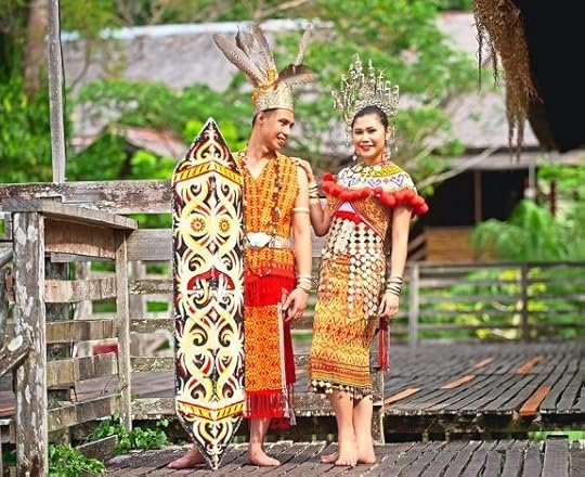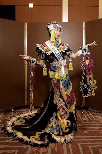 2. Miss Malaysia International Charmaine Chew--Inspired by the Malay Sarawak Tribe, this costume fuses the striking colors and unique embroidery of the Sarawak of Malaysia, utilizing multicolored scroll-like sequined trim, feathers, yellow beads, on a beautifully-fitted black fit-and-flare gown. The design was striking, fashionable, and honored a part of the country's culture.