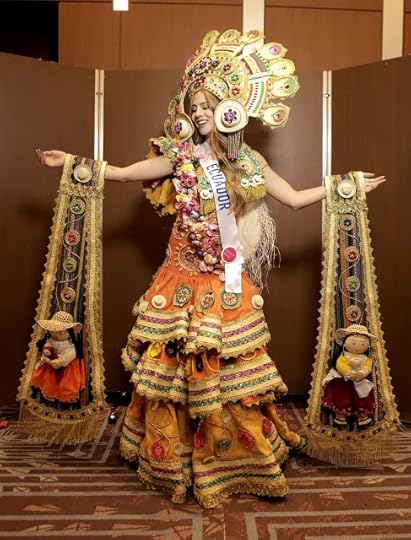 5. Miss Ecuador International Alegria Tobar Cordovez--Alegria's costume--designed by Manolo Loo--was said to be inspired by the artisanal work of Ecuador mixed in with Pre-Columbian Inca. I especially loved how seamlessly the costume mixed that Inca Empress headdress with traditional local items, such as the dolls, straw hats, and golden straw trim.