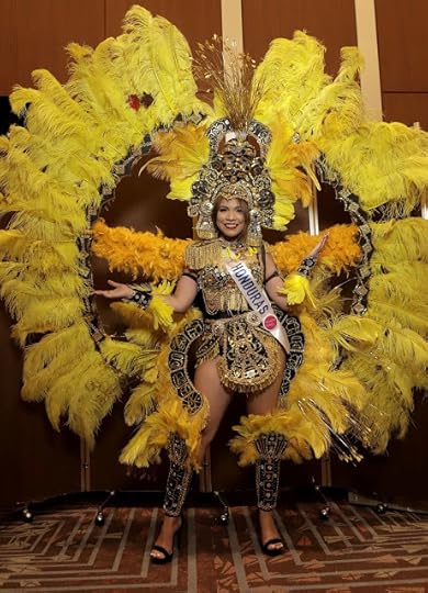 6. Miss Honduras International Ariana Bustillo--This was a fabulous Pre-Columbian-themed costume, showcasing vibrant canary yellow feathers, golden sequin trim and Native American Warrior Queen inspirations. The round "wing" in the back was pretty impressive, to say the least.