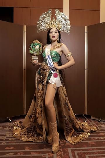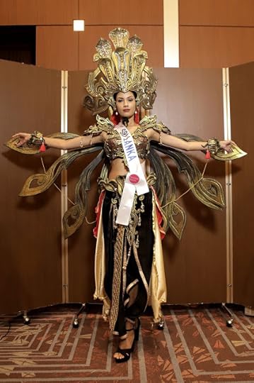 9. Miss Indonesia International Jolene Marie Rotinsulu--This costume is entitled "The Legend of Dewi Rengganis" and tells the story of King Brawijaya's daughter, who is one of the kings of the Majapahit Kingdom, Dewi Rengganis. According to their belief, the goddess Rengganis has a beautiful face. Her extraordinary beauty made the princes and kings of Java want to marry her. Dewi Rengganis is believed to be the ruler in the Argopuro region. It was designed by Diana Couture by Diana M. Putri. I loved the entire design--from the emerald green bustier-bodysuit, golden split-front skirt and that gold winged headdress. And yes, I also loved those calf-grazing nude sequined platform boots!