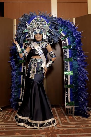 10. Miss Belize International Selena Marias Urias--Following the trend of the Pre-Columbian costumes, the Belize contestant wore this dark navy blue skirt and top with gold trim and super-impressive feathered headdress featuring silver and green sequin details. This was a very nice design and impressive costume effort worthy of a Top Ten!