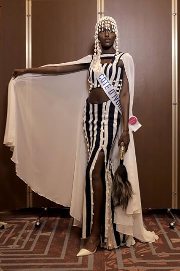 12. Miss Cote D'Ivoire Tara Gueye--Inspired by the Yacouba dancers from the West of the Ivory Coast (Cote D'Ivoire), this costume featured black-and-white striped top and skirt, shell detail and headdress and white chiffon cape. I really liked this chic and yet, still somewhat traditional design.
