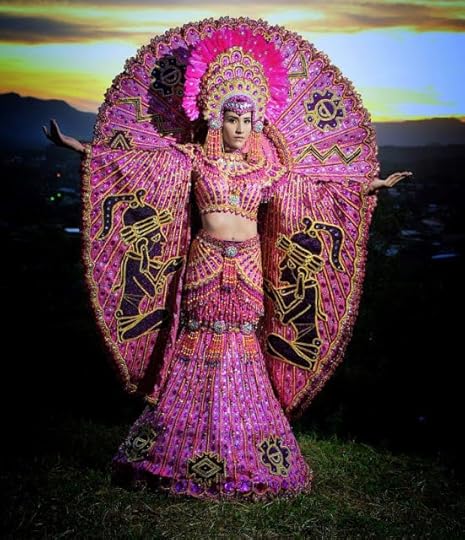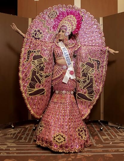 14. Miss Nicaragua International Maria Gabriella Saballos--Gabriella's costume is a tribute to all women of Nicaragua entitled "Nicaraguan Women: History, Inspiration, and Beautiful", in this elaborate pink-based sequined costume featuring a crop-top, mermaid-shaped skirt, and exuberant headdress. In addition, there were Pre-Columbian Native American images on the exaggerated sleeves. Muy Bien!