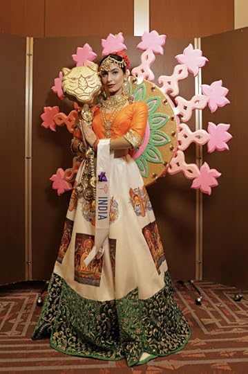 17. Miss India International Simrithi Haresh Bathija--The national costume of Miss India International is inspired by "The Incredible India" and designed by Neha Kumar. Incredible India is the name of an international tourism complex that is designed by the Government of India to project various aspects of Indian culture as an attractive tourist destination of India. The name of the dress is Lehenga Choli, which depicts the national flag and culture of India, the scene behind the dress is known as Kathakali which is a classical dance in India, as well as the upper part of the national dress, is known as the lotus which is the national flower of India. The Bengal tiger is the hand prop of the symbol of the national animal of India. The headgear is known as Mattha Patta and Gajra and the name of the jewelry is Rani Haar(neckpiece). The overall look is impressive and very-well done.