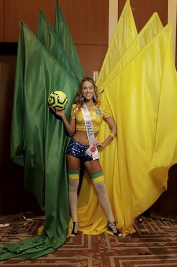 19. Miss Brazil International Carolina Stankevicius Cruz--What a shocker a Brazilian representative would don a futbol/soccer-inspired look for their Miss Brazil National Costume. The yellow/green and blue of the Brazil flag are featured prominently. I kind of love how the sequined blue "world" of the Brazilian flag was done as hot pants (shorts), and the yellow and green flag "wings" were on Brazilan Botox as in their exaggerated sizes! Only thing: I wish she would have worn some fab sneakers/kicks as opposed to those tacky looking black heels.