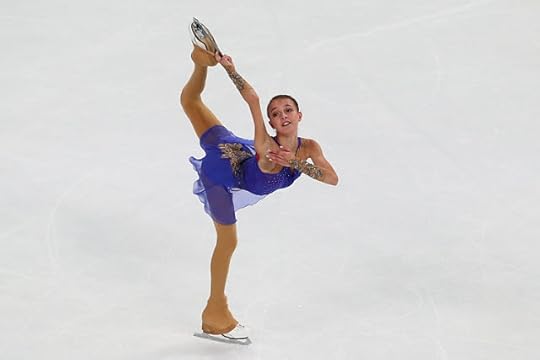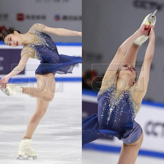 Alena Kostornaia Short Program--Skating her Short Program to Departure (Lullaby) from "The Leftovers" (soundtrack) by Max Richter and November by Max Richter, Alena wore this white costume (in keeping with the white looks seeing in the HBO show) featuring subtle blue tie-dyeing, dark blue/gray accents on the sides and back and delicate beading (it's Figure Skating, after all). I thought the dye detail formed quite a nice design on the torso of the costume, almost giving a sea creature-like effect.