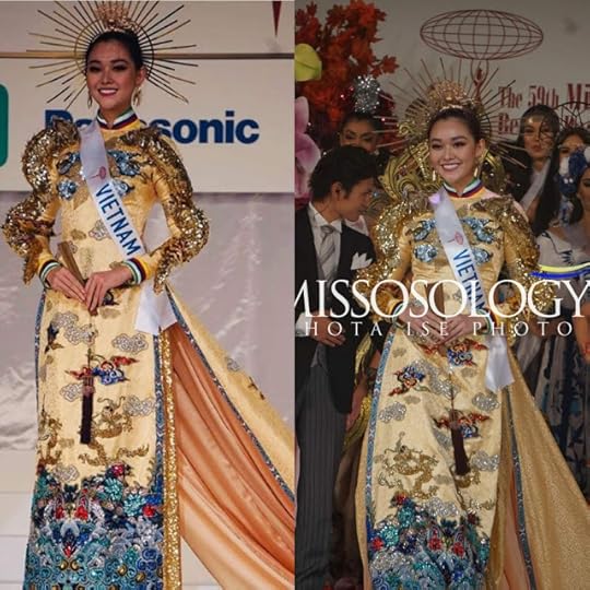 7. Miss Vietnam International Nguyen Tuong San--Showing the traditional Ao Dai in a more High Fashion "Fantasy" manner, the Vietnamese entrant looked regal-like and above-it-all. The costume featured a gold jacquard base fabric in a column dress with an extra-long train. The costume had very intricate embroidery and sequin work, especially on the shoulders. The colors of the Vietnamese flag were featured on the Mandarin collar and sleeve hems. The spiked "halo" crown headdress and fan finished it all off.
