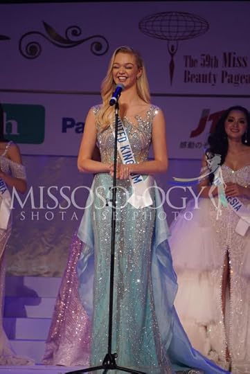 6. Miss United Kingdom International Harriotte Lane--The very tall (6 feet tall) Harriotte Lane looked even taller in this column-shaped baby blue gown. It featured a sequin overlay with baby blue satin lining, nude illusion top section and cascading silk satin back overskirt. It was pretty but a minute away from looking a bit too "figure skating costume".