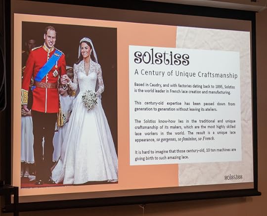 Mr. Damide of Solstiss approached us about having a special "Master Class" at FIDM to talk about Lace. Based in Caudry France and established in 1974, Solstiss creates some of the most beautiful and luxurious lace in the world with clients ranging from Alexander McQueen, GivenchyOscar de la Renta, Jason Wu and many more. Their gorgeous lace was used in Kate Middleton's Alexander McQueen wedding gown. Originally the same design of lace was worn by Grace Kelly in her wedding dress to marry Prince Rainier of Monaco in 1956.