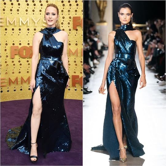Rachel Brosnahan in Elie Saab Haute Couture Fall/Winter 2019--"The Marvelous Mrs. Maisel" actress Rachel Brosnahan looked beautiful in this deep mint blue gown from Elie Saab Haute Couture Fall/Winter 2019. The completely sequined gown featured a wrap-like neckline, ruffled peplum, side drape, and high side slit. It was one of my TOP FAVORITE looks.