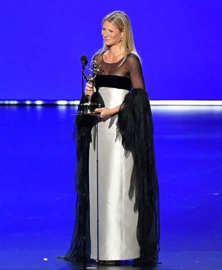 Gwyneth Paltrow in vintage Valentino Couture 1963--Gwyneth Paltrow wore this exquisite example of vintage Alta Moda design from her favorite couturier (and friend) Valentino. The black and white gown (which I immediately knew was Valentino when I first saw it!) was from Valentino's Couture archives from 1963. It featured a white silk duchesse skirt attached to a silk velvet and sheer black silk chiffon neckline panel. The perfect 60's flourish was those feathered sleeves.